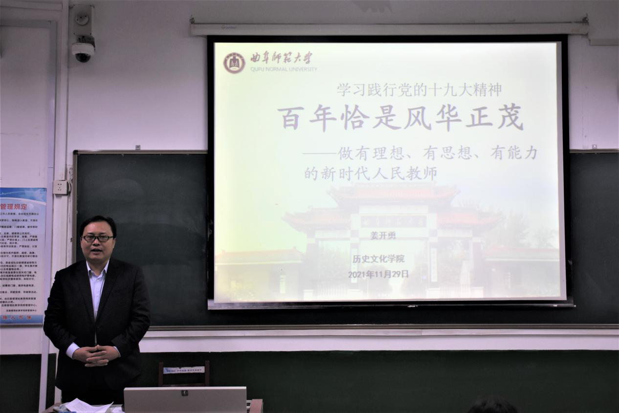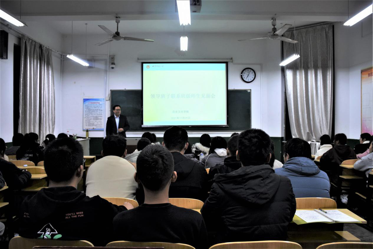 11月29日晚,幸运飞艇 党委书记姜开勇于文史楼309教室给联系班级讲思政课,并顺利召开了领导班子联系师生见面会,2021级公费师范生班全体成员参加会议。