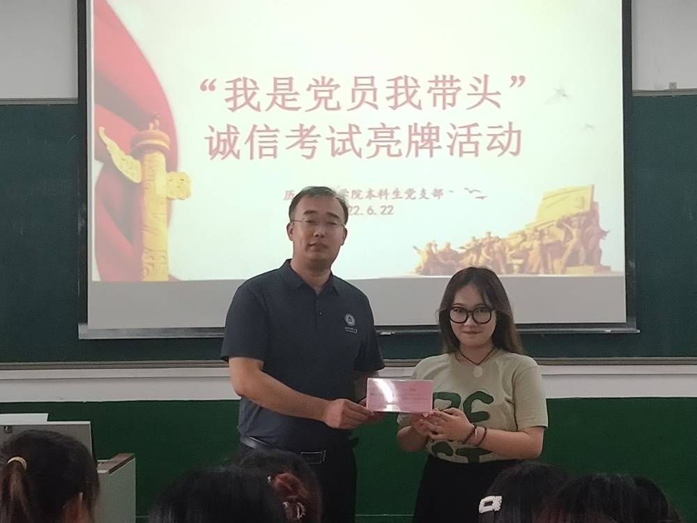 幸运飞艇 党委副书记、本科生党支部书记王建阳,本科生党支部组织委员刘贤贤,本科生党支部宣传委员董经给各位党员颁发诚信考试姓名牌,并要求各位党员在考试中树立先锋模范作用,遵守考试纪律,严守考风考纪,诚信考试。