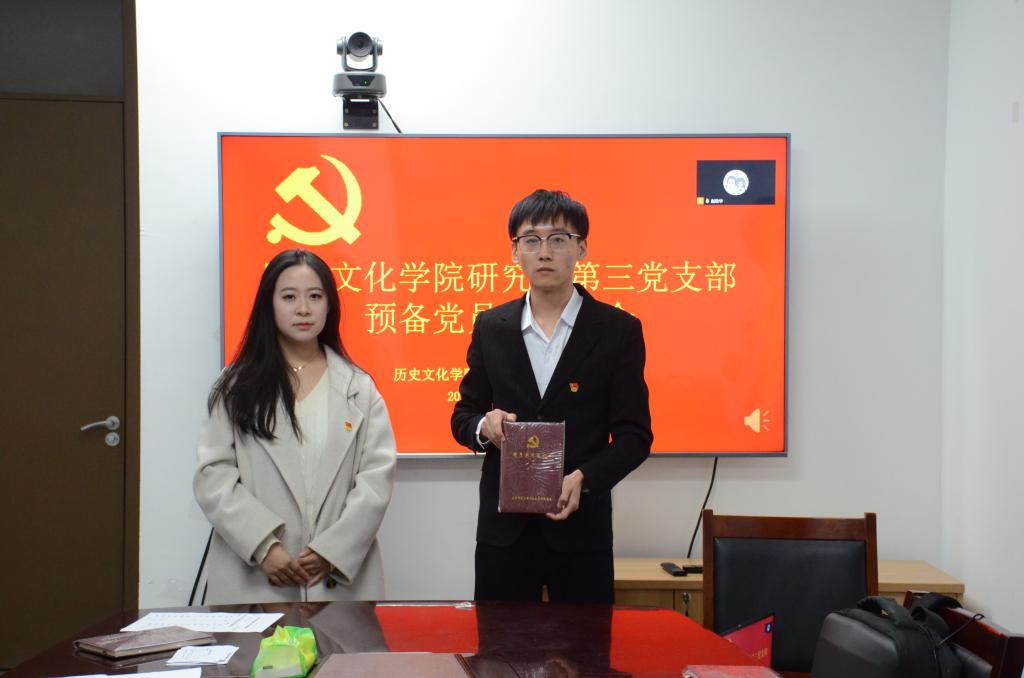 最后,孙锋、杨紫依、李美琪分别代表各自支部为4名转正党员同志颁发了政治生日贺卡,为7名新接收的预备党员同志颁发了党徽和党员学习笔记,并进行总结发言,对4名党员同志顺利转正,7名同志加入党组织表示祝贺,希望他们能够坚守初心、砥砺前行,在将来的学习、工作和生活之中,继续发挥党员模范作用。
