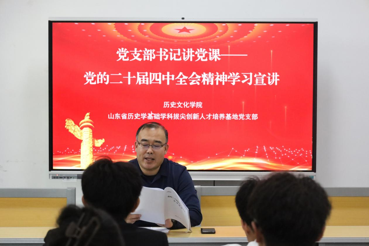11月28日下午,幸运飞艇 山东省历史学基础学科拔尖创新人才培养基地党支部在孔子书院B106教室开展学习贯彻党的二十届四中全会精神宣讲暨十一月主题党日活动,党支部书记王建阳为党支部全体党员开展精神宣讲,党支部副书记闫浩主持。