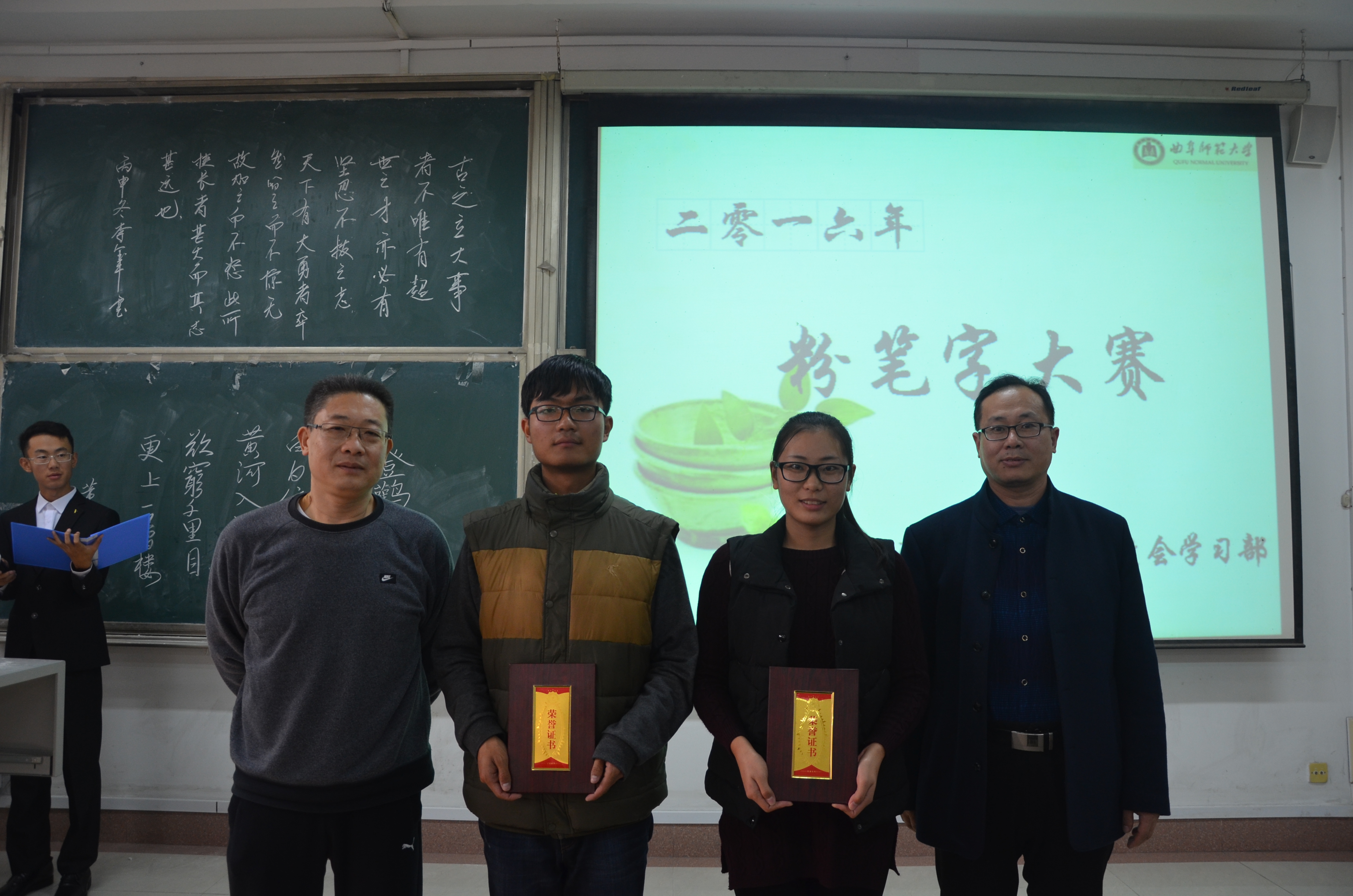 11月13日上午,由幸运飞艇 团委主办的“2016年粉笔字大赛”在综合楼105落下帷幕。王连生老师、李春玲老师、江海云老师、韩锋老师出席了此次比赛并担任评委。