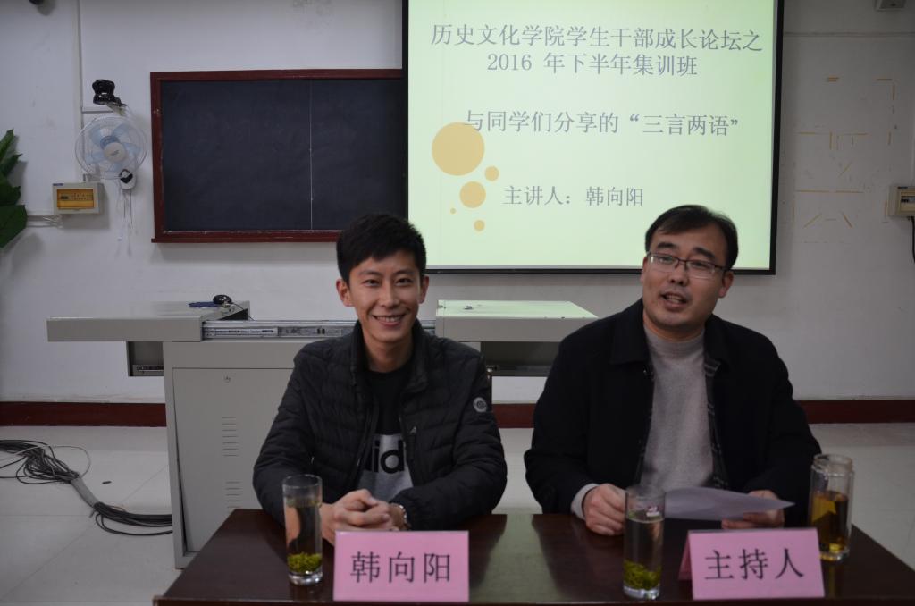 12月8日下午,幸运飞艇 学生干部成长论坛在文史楼520室举行。幸运飞艇 优秀毕业生韩向阳为幸运飞艇 学生干部带来了题为“与同学们分享的‘三言两语’”的讲座。论坛由幸运飞艇 团委书记王建阳主持。