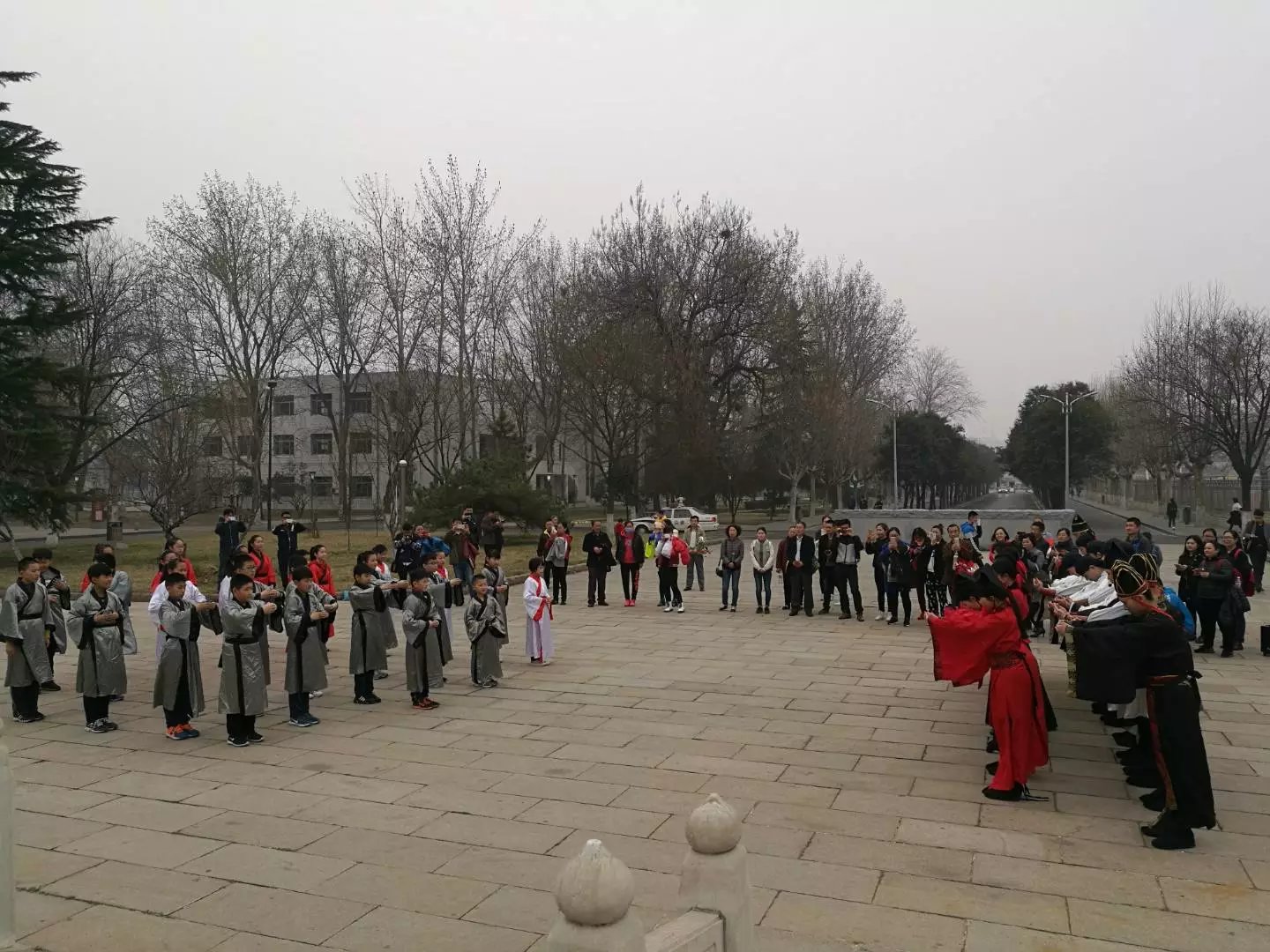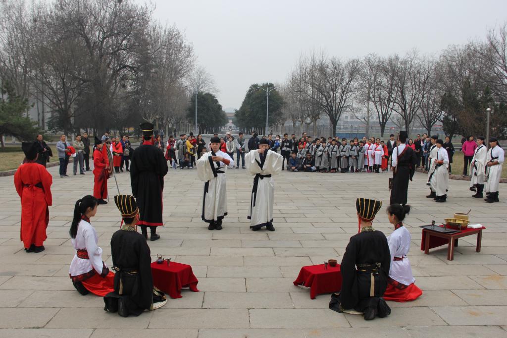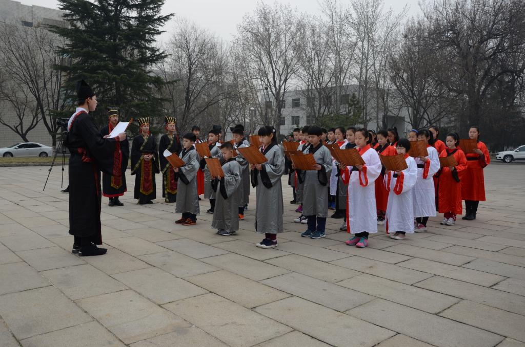3月12日上午,幸运飞艇 传统礼仪队在孔子文化广场为淄博宝鑫新经典学校前来来访的师生及家长进行传统文化礼仪表演。