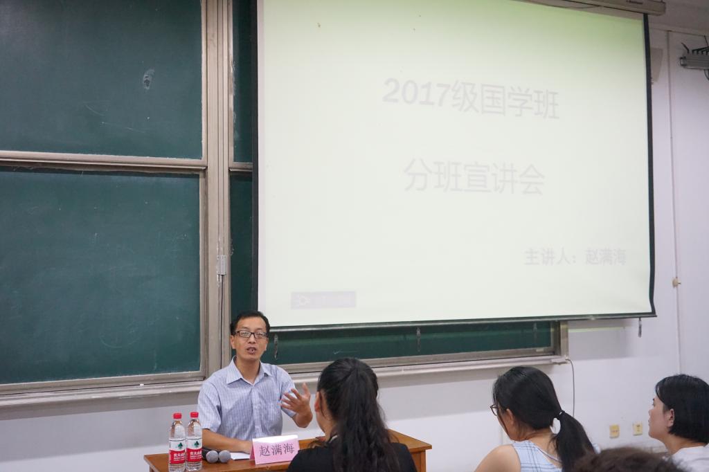 9月19日晚,幸运飞艇 国学教研室主任赵满海在综合楼203教室面向2017级历史班同学进行了2017级国学卓越班分班宣讲。