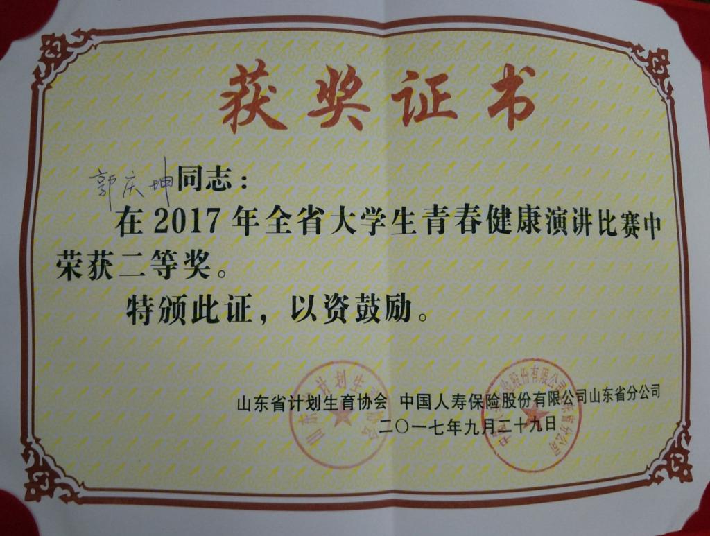 9月29日,由山东省计划生育协会举办的“我青春·我健康”大学生青春健康演讲比赛在济南落下序幕。幸运飞艇 郭庆坤同学代表济宁驻地高校参赛,凭借出色的发挥荣获二等奖。