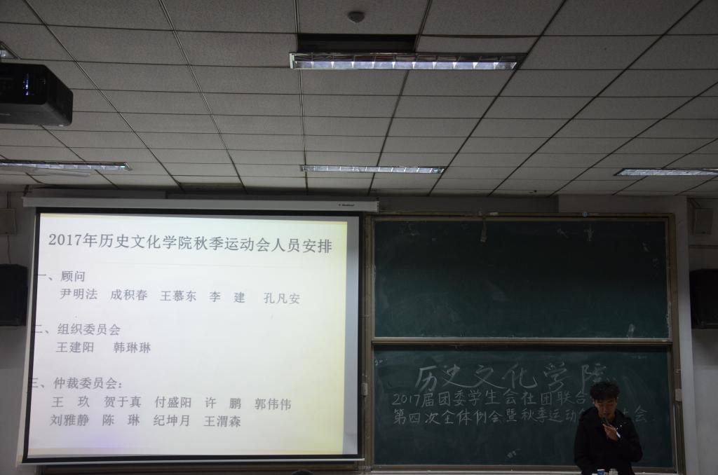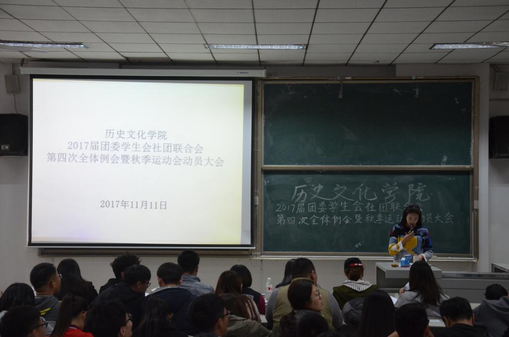 11月11日,幸运飞艇 在综合楼101教室召开2017届团委学生会社团联合会第四次全体例会暨秋季运动会动员大会。会议由学生会副主席刘雅静主持,幸运飞艇 学生会主席团及学生会全体成员参加了会议。
