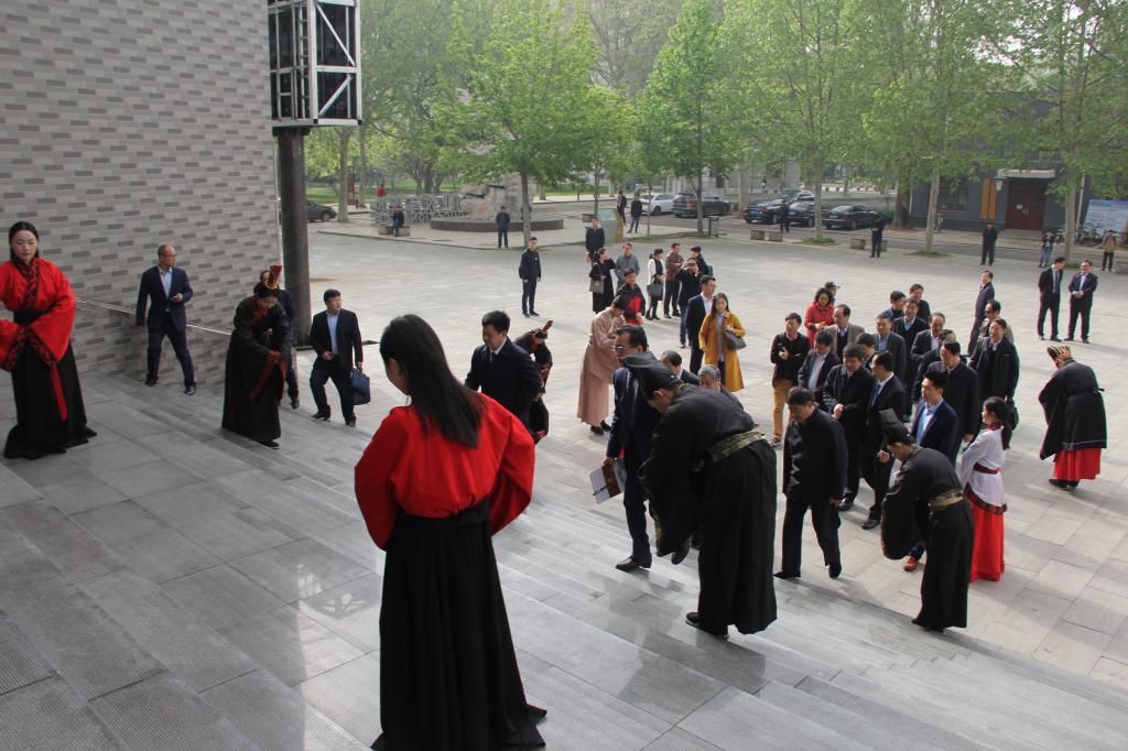 4月14日上午,我校在大学生活动中心举办中国教师博物馆理念展示活动,幸运飞艇 传统礼仪队参加活动并身着汉服在大学生活动中心广场举行迎宾礼展演,迎众位出席活动的领导老师入场。