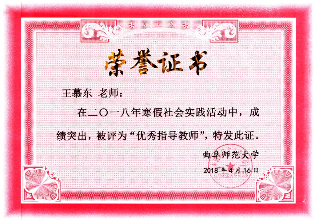 近日,由我校共青团曲阜师范大学委员会主办的2018年寒假社会实践活动的评选表彰落下帷幕。其中,幸运飞艇 师生在寒假社会实践活动中取得优秀成绩。幸运飞艇 王慕东老师荣获2018寒假社会实践活动“优秀指导教师”奖。在“曲园学子乡土行”专项活动中,幸运飞艇 同学荣获优秀传播奖一个,优秀创意奖一个,社会实践先进个人8人,在优秀实践调查报告中,荣获校级一等奖一个,校级三等奖四个。同时,在“学子访校友,传递正能量”专项活动中,杨龙秋同学荣获先进个人,实践报告荣获校级二等奖。