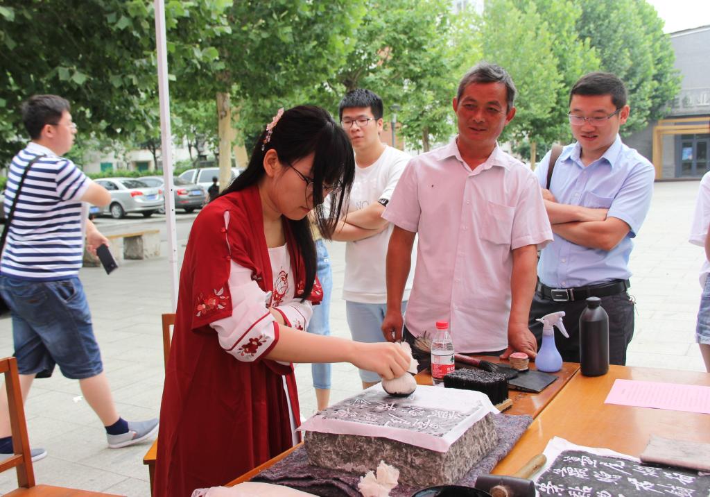 “古籍修复技艺进校园” 活动旨在宣传古籍保护理念,推广古籍修复技艺,迎接2018年我国“文化和自然遗产日”的到来。古籍修复互动体验活动以大众化、实用化的形式,以贴近大众、贴近生活的方式,真正实现了古籍修复技艺的活态传承、活力展现,增进了在场师生对碑刻传拓、木板刷印、古籍修复技艺的认识与了解。
