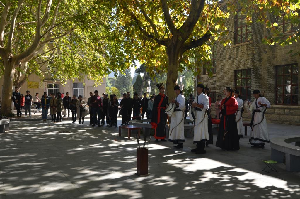 综合楼前广场上,随着弦和之乐缓缓奏起,传统礼仪展演队成员们身着汉服,头顶儒冠,在三圣画像前按照传统礼仪仪程展演“束脩礼”。西联广场前,同学们进行了射礼的展演。庄严、古朴的礼仪展演深深吸引了在场观礼的老师嘉宾,在独特的儒家氛围中,以彬彬古礼展现出尊师明道的深厚文化底蕴。