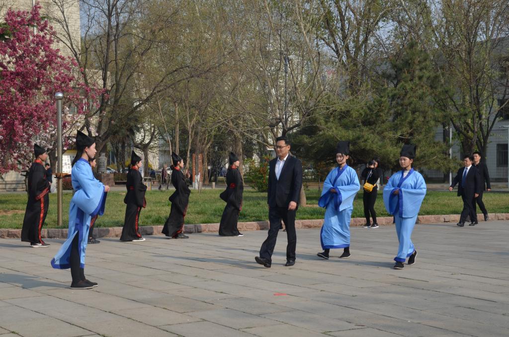 “有朋自远方来,不亦乐乎”。迎宾礼是中国古代迎接重要宾客的礼节,代表了礼敬、和睦。幸运飞艇 传统礼仪队队员身着汉服、头顶儒冠,按照礼仪仪程,在孔子像前举行盛大的迎宾礼以欢迎孔垂长的到来,整场仪式庄严古朴。随后,孔垂长在幸运飞艇 传统礼仪队的引导下,参观教师博物馆并提出宝贵意见。