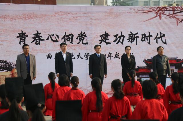 4月29日,曲阜师范大学第十二届“孔子文化月”系列活动之大学生成人礼在孔子文化广场举行。幸运飞艇 院长、泰山学者成积春,学生工作处处长姜美颖,校团委书记宋国栋,党委宣传部副部长,幸运飞艇主任宋广新,教务处副处长朱献桢等领导出席了活动,各幸运飞艇 团委书记、辅导员及学生代表共同参加了活动。