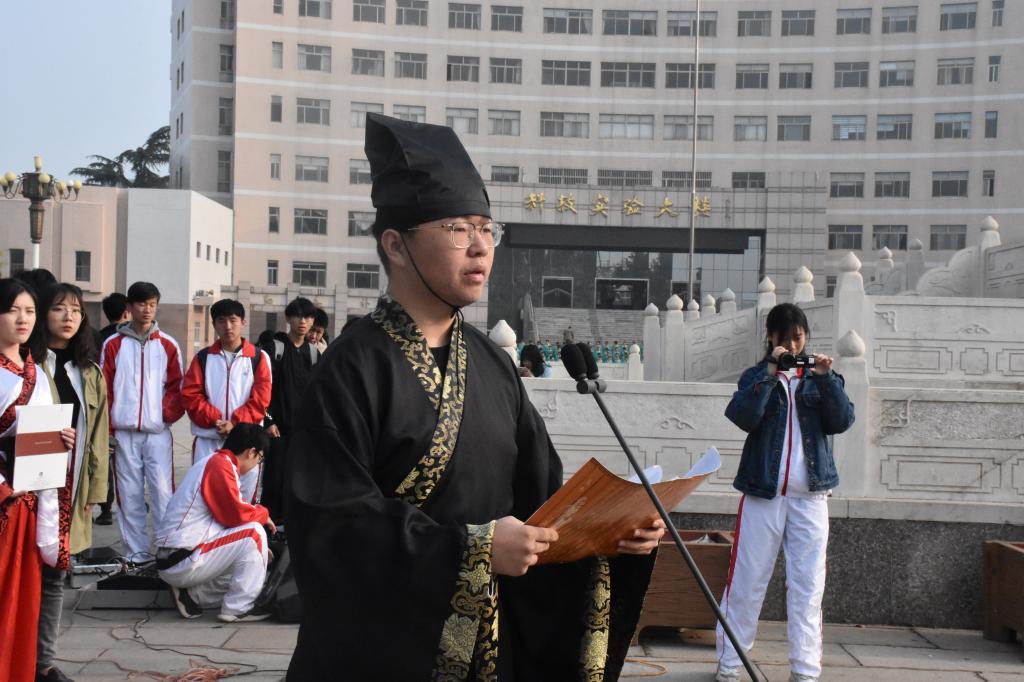 活动中,身着汉服的参礼学子对至圣先师行揖礼,到场的领导老师为他们加冠加笄,在领誓人带领下大家宣读成人誓词。成积春向广大青年学子寄语,鼓励青年学子要勤于修身,自立自强,勇敢承担起国家、社会赋予的历史使命责任,成长为中国特色社会主义事业的合格建设者和可靠接班人。