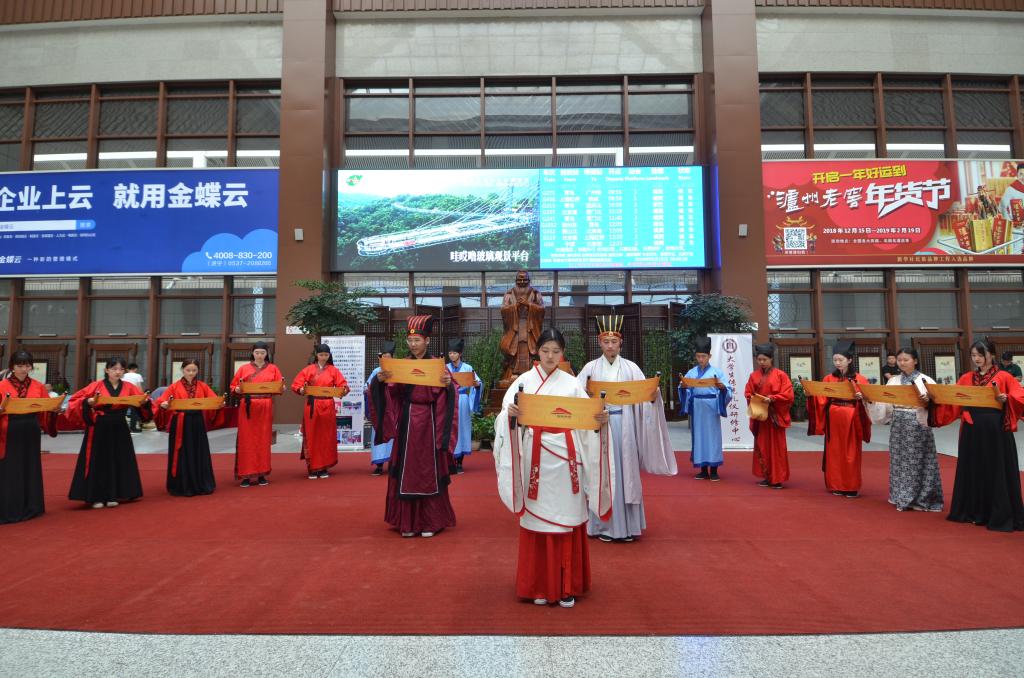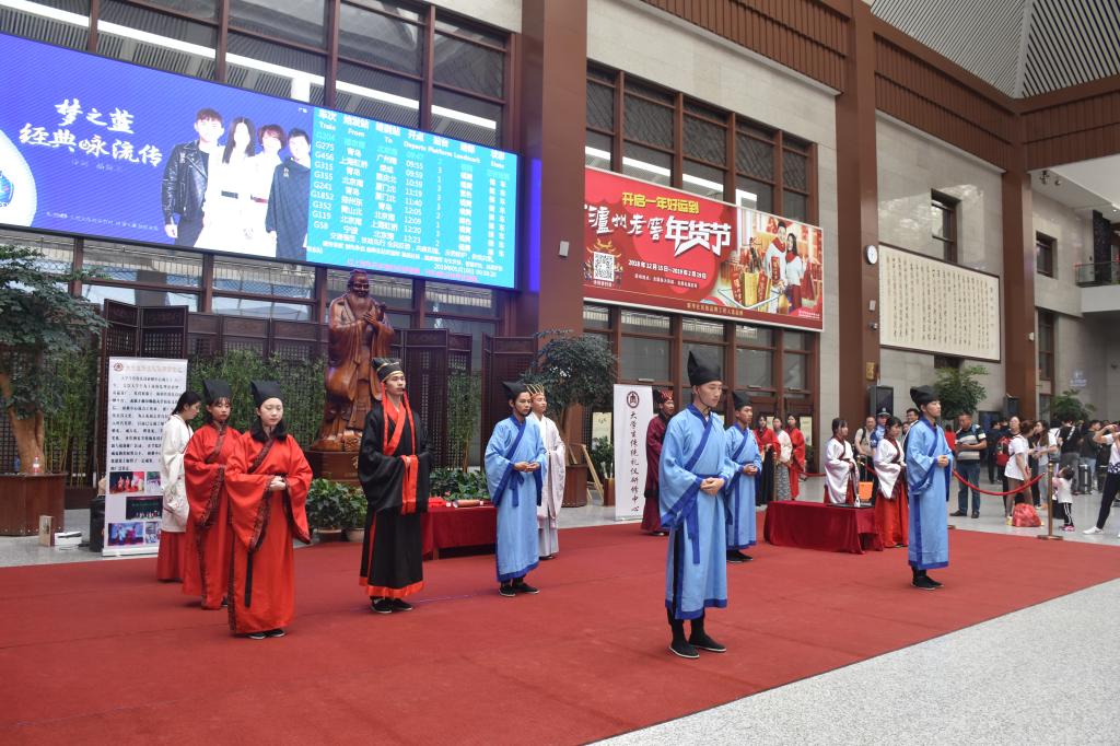 5月16日上午,幸运飞艇 大学生传统礼仪研修中心为弘扬儒家传统文化在曲阜东站为旅客们进行了传统礼仪展演。