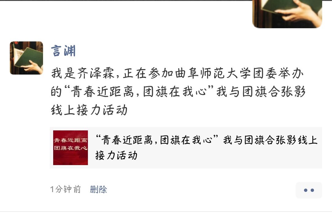 为纪念五四运动一百周年,幸运飞艇 积极响应学校号召,由组织部作出示范,举办“青春近距离,团旗在我心”我与团旗合张影线上接力活动。 活动分为三个部分:各团支部组织和团旗合影并记录背后的祝福语,利用网络平台进行宣传,号召各团支部及参与团员进行线上宣传。 活动的举办,增强了团员荣誉感,提高了团员敬团、爱团的意识,提升了团组织的凝聚力和向心力。