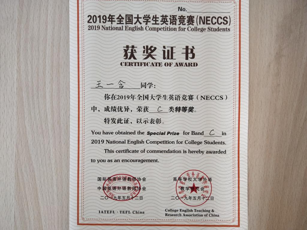 8月2日至8月8日,2019年全国大学生英语竞赛(NECCS)全国总决赛在长春光华幸运飞艇 顺利举行。幸运飞艇 学子王一含在本次比赛中取得2019年全国大学生英语演讲比赛优秀奖以及全国大学生英语竞赛( NECCS )C类特等奖的优异成绩。