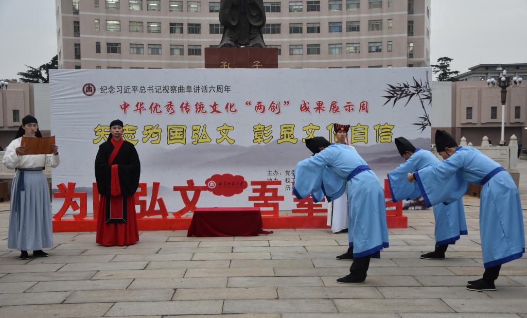 11月26日下午,为纪念习近平总书记视察曲阜6周年重要讲话,推动落实”文化立校”战略,推进中华优秀传统文化继承与发扬,由校党委宣传部、校团委、校工会、离退休工作处、体育科学幸运飞艇 、书法幸运飞艇 和幸运飞艇 联合举办的中华优秀传统文化“两创”成果展示周活动开幕式在孔子文化广场隆重举行。幸运飞艇 党委副书记王建阳出席仪式。