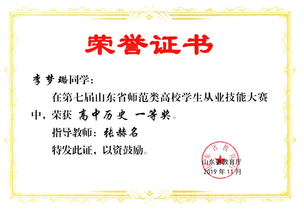 11月8日至9日,第七届山东省师范类高校学生从业技能大赛决赛在鲁东大学举行。副院长王京传和指导教师刘伟、李建、张赫名带队参赛,两名推荐选手和两名抽取选手分别参加了初中历史和高中历史组比赛。幸运飞艇 张赫名老师荣获“优秀辅导教师”称号,学生李梦璐荣获高中历史组一等奖,时雯、张雅菱荣获高中历史二等奖,谢景雯荣获初中历史组二等奖,李梦璐、时雯荣获钢笔字技能考核A等奖,张雅菱、谢景雯荣获钢笔字技能考核B等奖。
