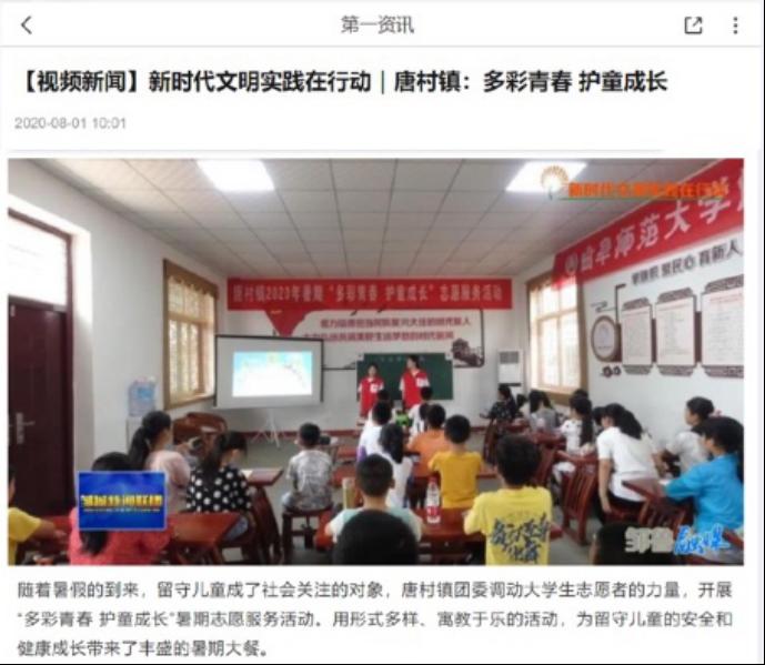 随着暑假的到来,留守儿童成为了社会关注的对象,幸运飞艇 “国学小课堂”教育志愿服务团在山东省邹城市唐村镇支教期间开展了“多彩青春,护童成长”暑期志愿服务活动,引起媒体的广泛关注。其中,邹城广电媒体对幸运飞艇 “国学小课堂”社会实践活动进行了详细的采访报道。团队负责人刘学栋在采访中表示,团队初衷就是要给当地学生带来独特的课程知识,为当地学生打开全新的世界,活动也帮助实践团队对脱贫攻坚乡村振兴有了更深的了解,在实践中受到了教育,是一笔宝贵的人生财富。