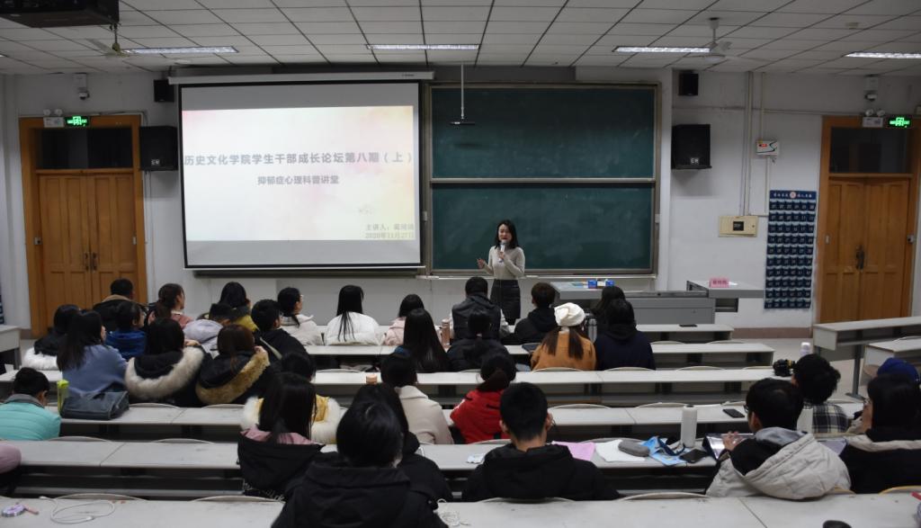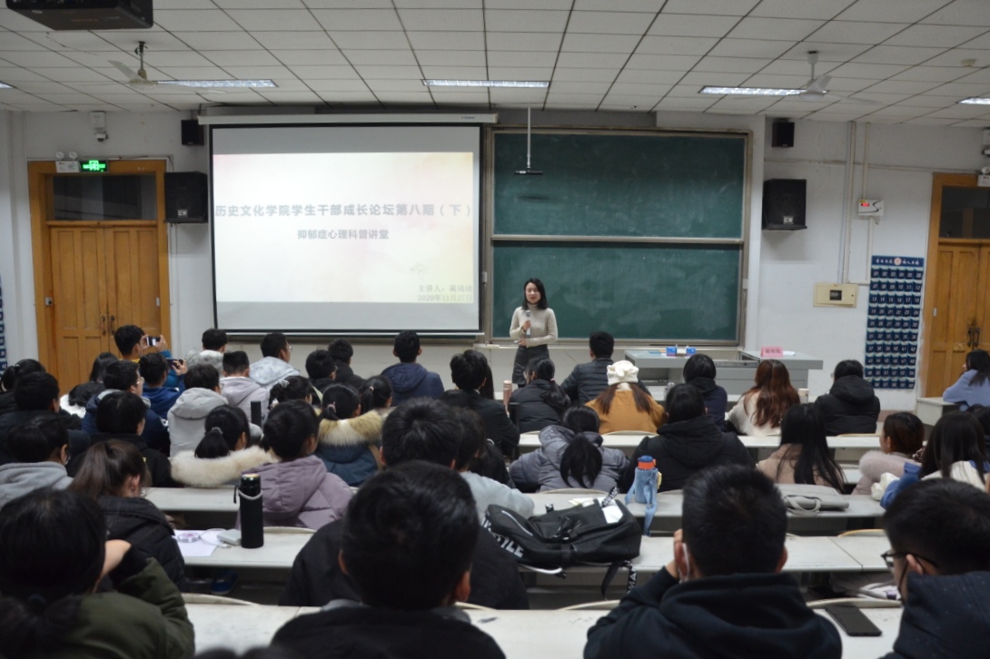 11月27日晚,幸运飞艇 举办2020年第八期学生干部成长论坛之抑郁症心理科普讲堂。论坛邀请2018级辅导员蔺琦琦作为主讲人。幸运飞艇 各班的心理委员、班长、团支书、副班长、副团支书以及各宿舍的宿舍心理信息员参加会议。 会上,蔺琦琦从心理信息员的角色定位、大学生常见心理问题成因和如何识别心理问题三个问题展开。同时,蔺琦琦向同学们科普抑郁症知识,并针对大一到大四同学普遍出现的心理问题,提出了解决建议。 抑郁症心理科普讲堂的举办,向同学们普及了抑郁症的相关知识,帮助同学们科学地认识抑郁症,走出认知误区,有利于增强大学生自我心理保健意识,营造了关注心理健康、了解心理健康、重视心理健康的良好氛围。