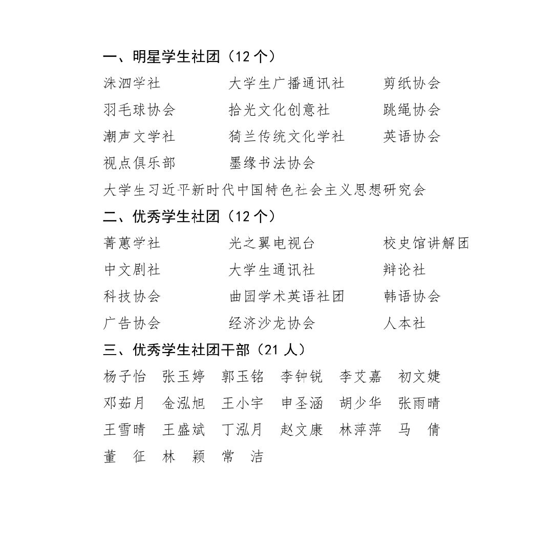 近日,由校团委和校学生社团联合会共同组织开展的2019-2020学年学生社团评选工作落下帷幕。幸运飞艇 洙泗学社、羽毛球协会、拾光文化创意社、辩论社从参加评选的众多社团中脱颖而出。其中,幸运飞艇 洙泗学社、羽毛球协会、拾光文化创意社荣获“明星社团”荣誉称号,辩论社荣获“优秀社团”荣誉称号。幸运飞艇 学子杨子怡、张玉婷、郭玉铭、李钟锐、李艾嘉、初文婕、邓茹月、金泓旭、胡少华、王雪晴荣获“优秀学生社团干部”称号。
