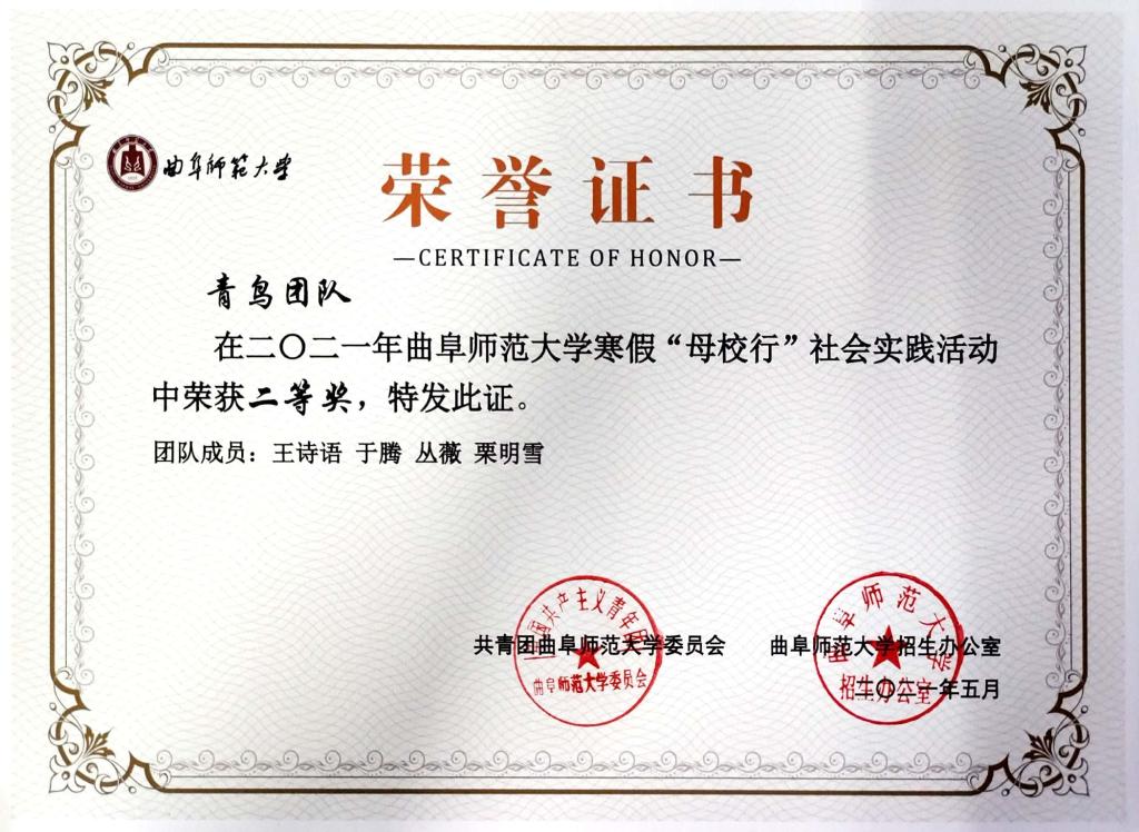 近日,“青鸟计划”主题实践活动与寒假“母校行”社会实践活动评选结束。幸运飞艇 学子在活动中取得佳绩。“青鸟计划”主题实践活动中,胡纪新、胡梦潭、柴皓鸽等18名同学被评为“优秀学子”。 寒假“母校行”社会实践活动中,儒风海韵日照一中小分队荣获一等奖,青鸟团队、属你唯“一”队荣获二等奖。