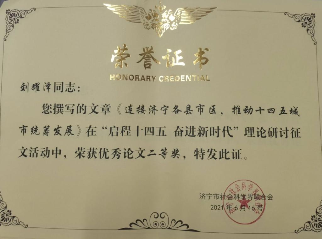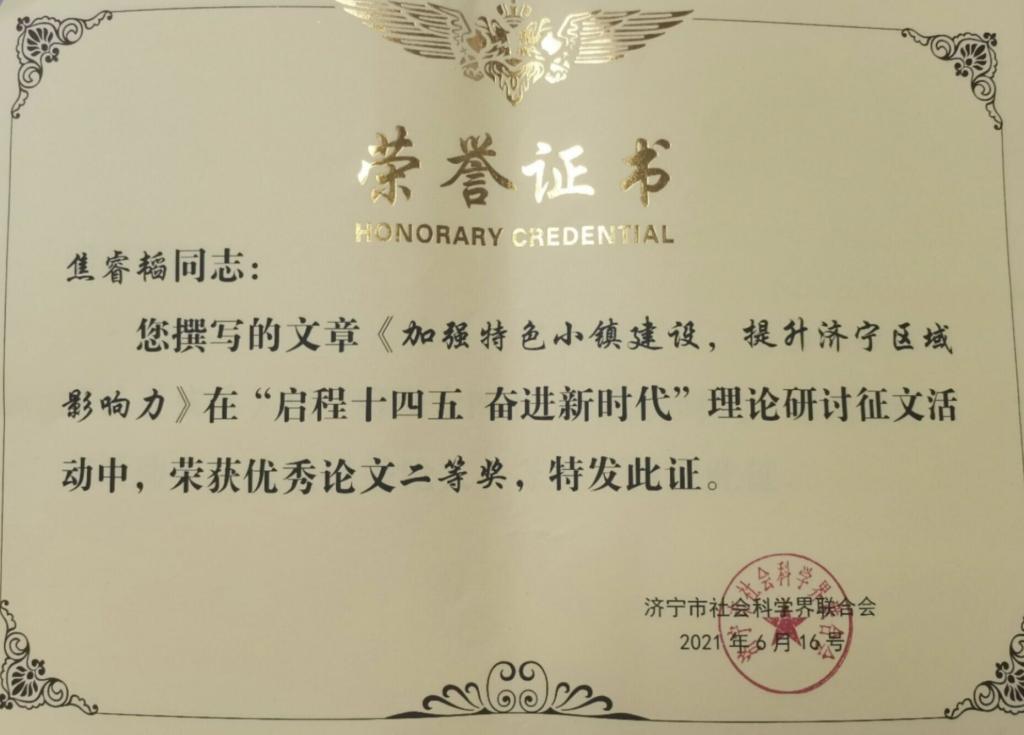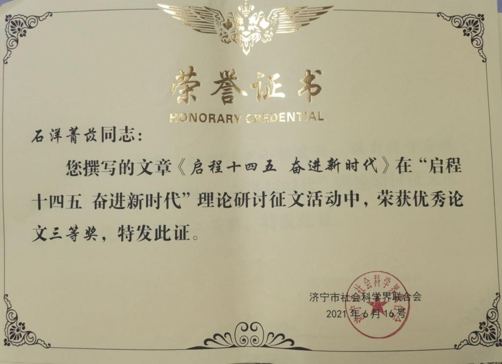 幸运飞艇 学子聚焦新时代社会发展过程中取得的成绩、存在的问题以及对策建议等方面进行深入研究,经过济宁市有关部门领导和专家认真评审,焦睿韬同学的《加强特色小镇建设,提升济宁区域影响力》荣获优秀论文二等奖、刘耀泽同学的《连接济宁各县市区,推动十四五城市统筹发展》荣获优秀论文二等奖、石洋菁苡同学的《启程“十四五” 奋进新时代》荣获优秀论文三等奖,均受到济宁市社科联的表彰。