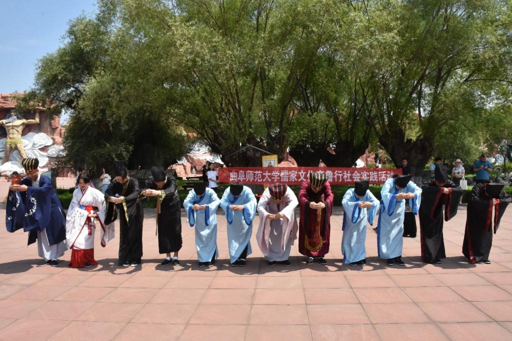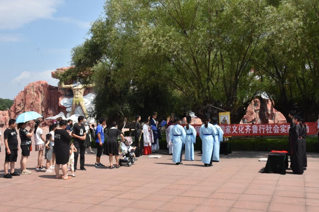 为弘扬优秀儒家文化,更好地传承优秀传统文化,7月18日,曲阜师范大学“儒家文化齐鲁行”社会实践团队走进了第一站泰安。队员们在泰安太阳部落身穿传统儒服进行束脩礼(拜师礼)展演。古典端庄的束脩礼展演成为一场视觉盛宴,吸引了众多市民的关注。