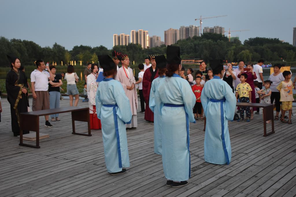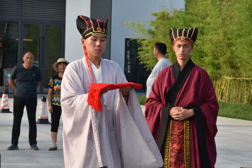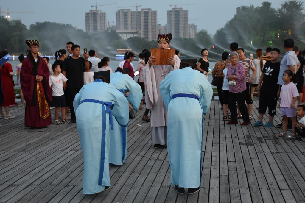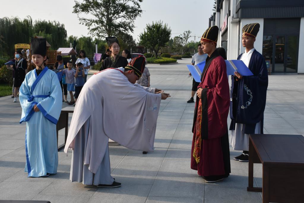 7月18日,曲阜师范大学“儒家齐鲁文化行”社会实践团队走进第二站宁阳。队员们在宁阳绿景·桃李春风、复圣公园进行束脩礼(拜师礼)展演,用整齐划一的表现给观礼群众带来了一场场精彩绝伦的礼仪表演。