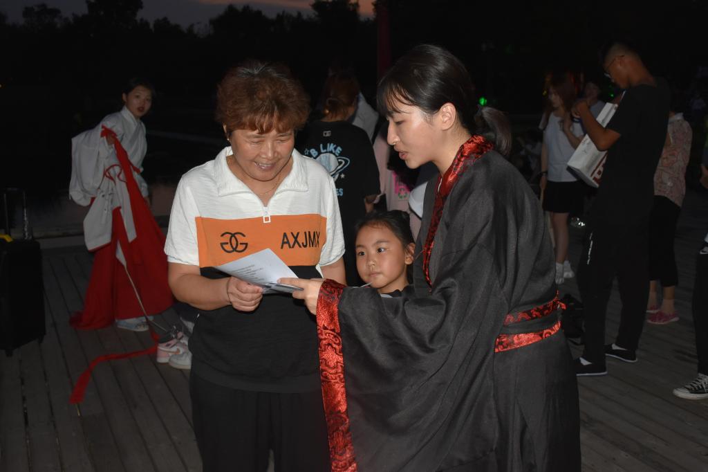 展演时,队员们伴随着宣赞庄严洪亮的声音,扮演师傅、宣赞、学子、侍者的队员各居其位,依次进行正衣冠、诵读《束脩告文》、献戒、执束脩、训诫、礼敬师儒等礼仪环节,一行一动,庄重整齐,引人驻足。展演结束后,身着古典儒服的队员们通过问卷调查、访谈等形式,进一步了解束脩礼在各地推广的可行性以及存在的问题,深入宣扬中华优秀传统文化。通过不同形式的探访,队员们纷纷感受到束脩礼等传统礼仪存在普及面小、影响度较低等现状。但大多数群众对束脩礼等传统礼仪展现出浓厚的兴趣,纷纷表示学到了不少知识。