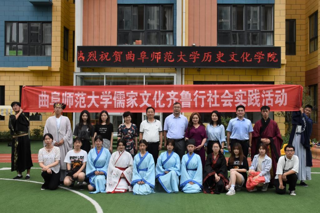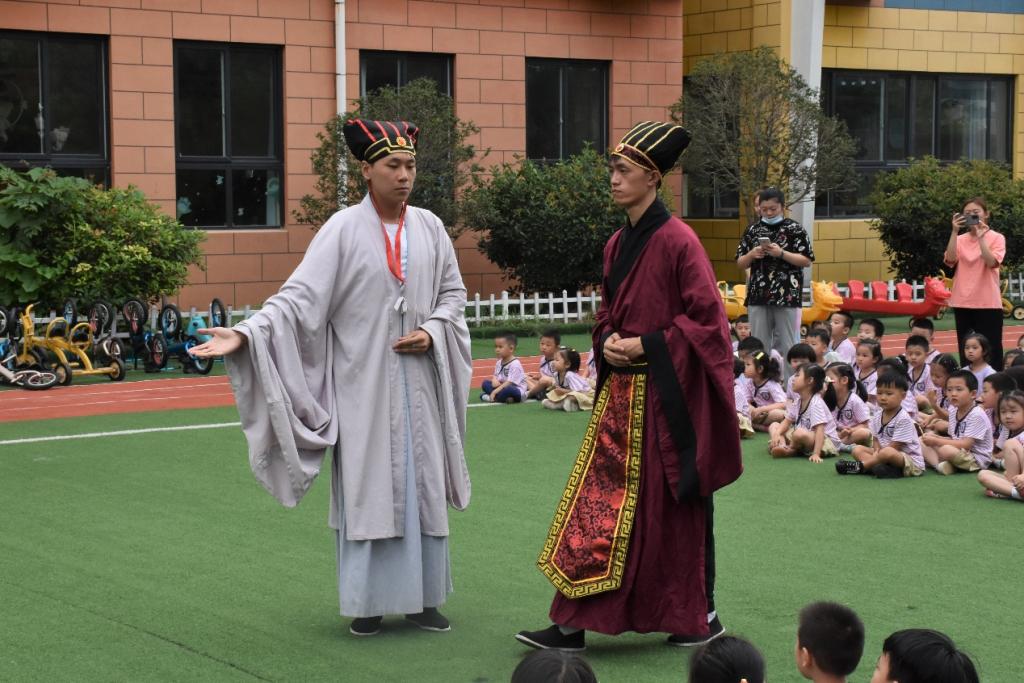 7月20日上午,曲阜师范大学“儒家齐鲁文化行”社会实践团队走进第三站济宁市。队员们身穿传统儒服在济宁新文国际幼儿园进行了束脩礼(拜师礼)展演。