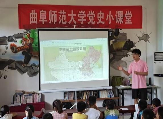 7月21日上午,志愿者们初次来到这个陌生而又亲切的地方,遇到了当地可爱的孩子们,并向孩子们介绍了曲阜师范大学与“党史国学小课堂”志愿服务队。志愿者用通俗的语言为孩子们介绍了大学的生活和自己所学的专业,展示了大学里很多有意思的活动,为孩子们打开了向往大学生活的钥匙。为了更好的相互了解,志愿者们进行了自我介绍,一开始的时候,孩子们十分害羞,不愿意去表现自我,只是默默的听着。在志愿者们的鼓励下,原本不愿意开口的孩子们都鼓起勇气,纷纷站起来进行自我介绍,展示自己与众不同的一面。“我会跳舞”,“我唱歌很好听”,“我会弹古筝”,“我喜欢打篮球”,“我自己写小说”,孩子们有各种各样的爱好与特长,而通过与志愿者们的交流,他们也变得越来越自信,脸上褪去了羞涩,洋溢着幸福的笑容。
