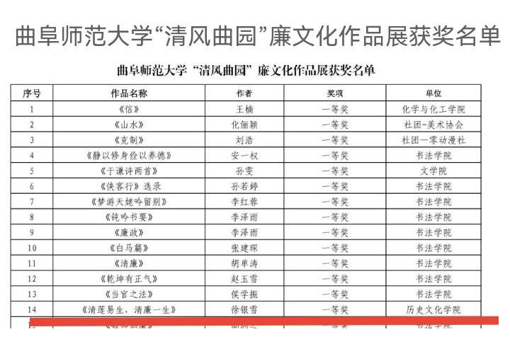 为庆祝中国共产党成立100周年,推进学校廉政文化建设和廉洁教育工作,我校纪委举办了“清风曲园”廉政文化作品征集活动。幸运飞艇 师生积极参与,在“清风曲园”廉文化作品展中荣获佳绩。