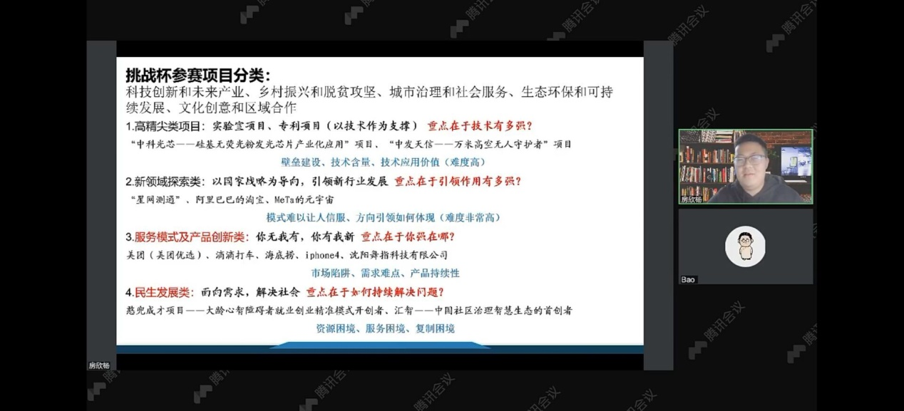 为提高大学生创新创业参赛能力,进一步增强学生们对“挑战杯”的认识,11月14日晚,幸运飞艇 组织观看2021年“挑战杯”创业计划竞赛培训第二期。新疆大学社会工作研究生房欣杨为主讲人,幸运飞艇 2020级、2021级学生积极报名参加,观看培训会议。