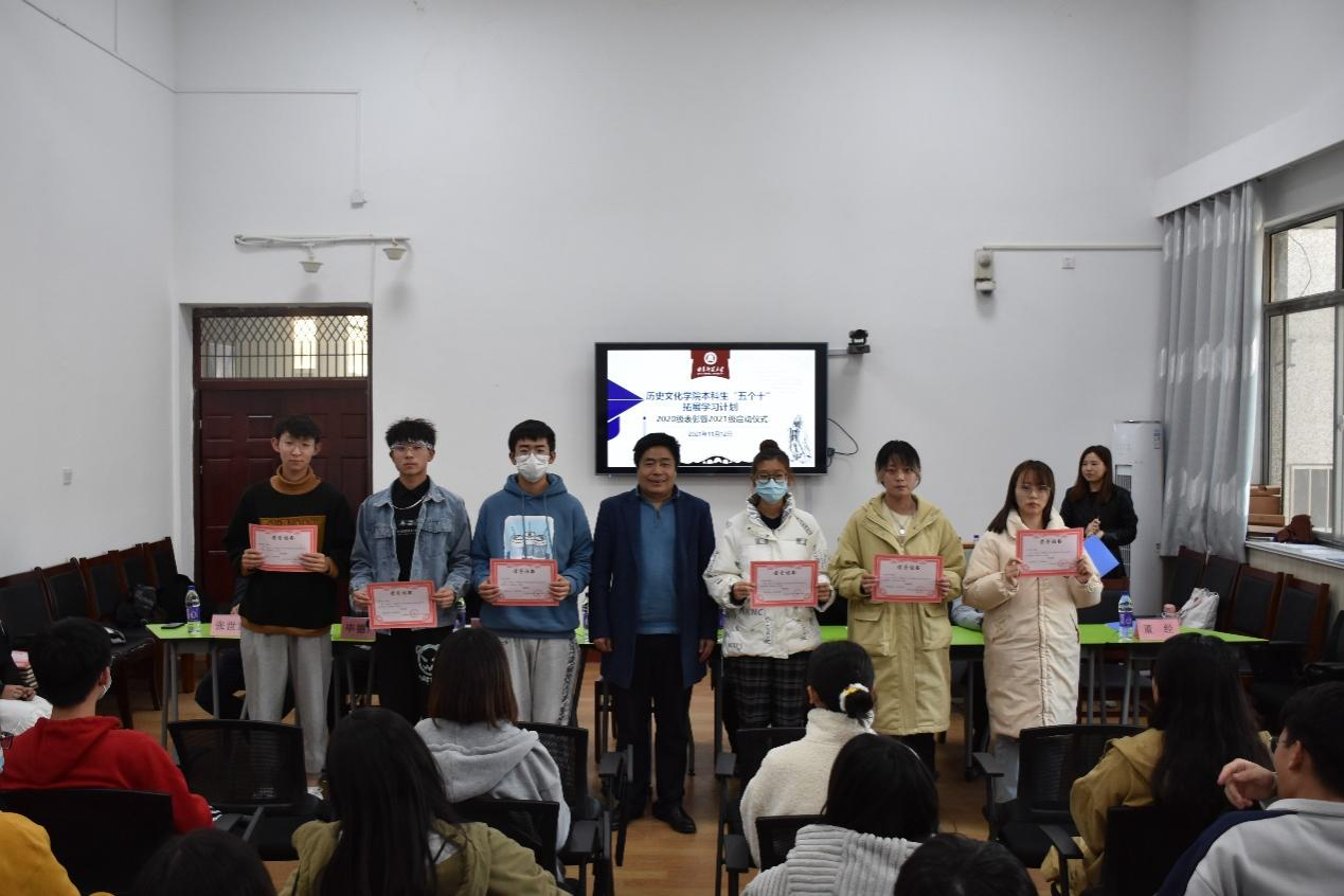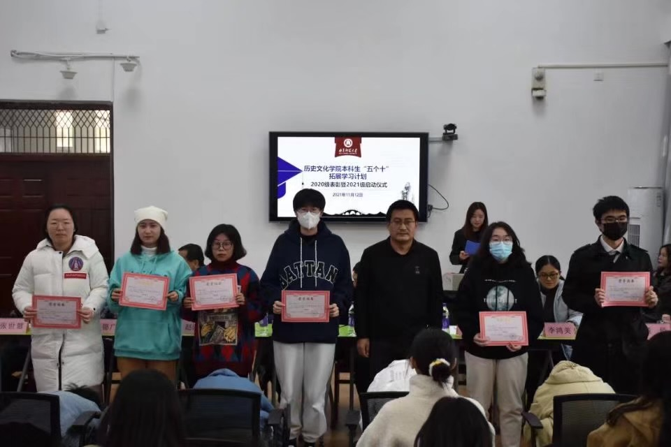 11月12日下午,幸运飞艇 在文史楼505会议室举行了本科生“五个十”拓展学习计划2020级表彰暨2021级启动仪式。幸运飞艇 副院长王京传老师、中国古代史教研室主任刘伟老师、国学教研室主任赵满海老师、文化产业管理教研室主任郝志刚老师、文物与博物馆学教研室主任毕德广老师、世界史教研室主任李鸿美老师、中国近现代史教研室主任张世慧老师、2021级辅导员刘贤贤老师、2020级辅导员董经老师出席会议,会议由2021级辅导员刘贤贤老师主持。