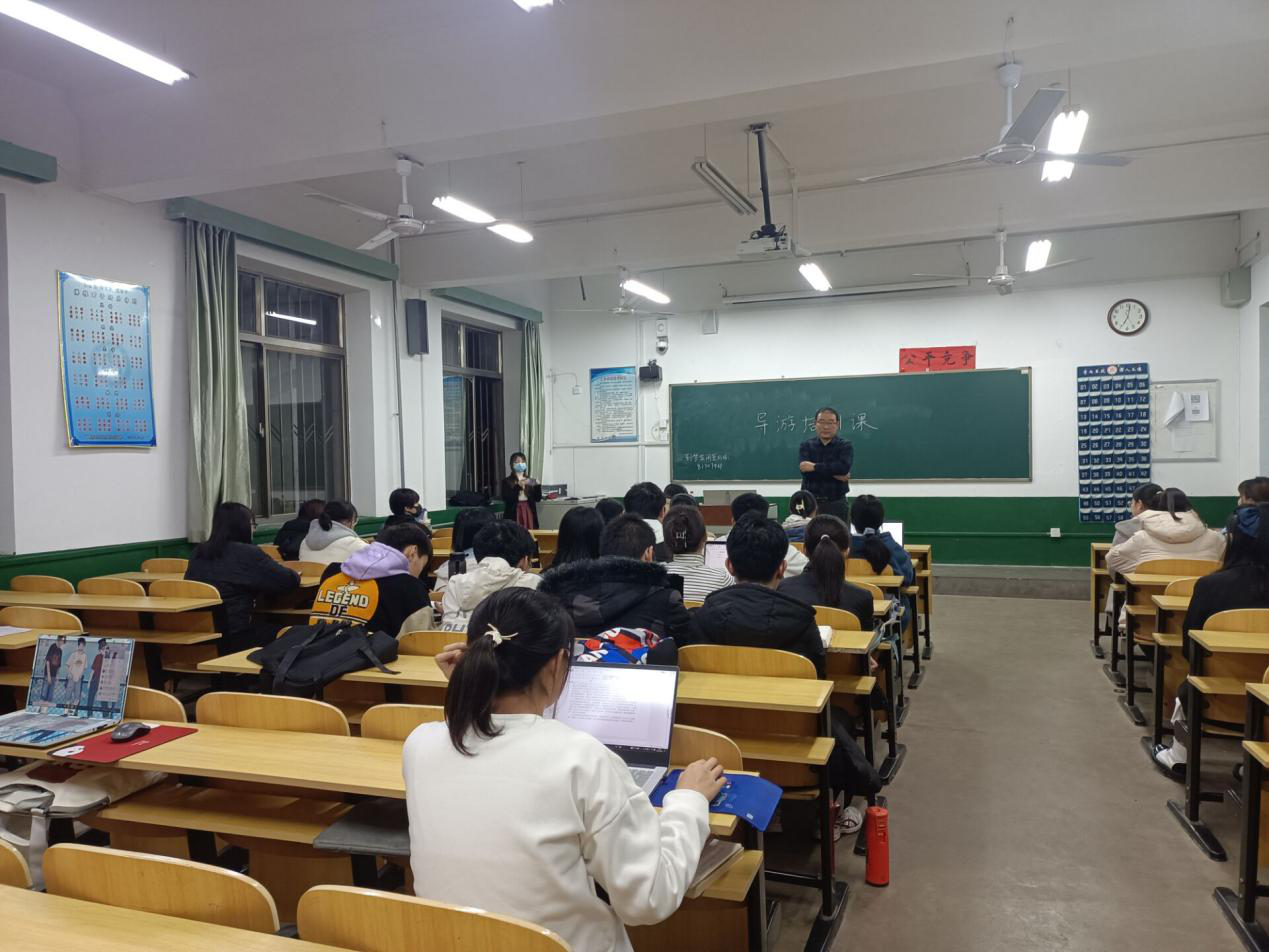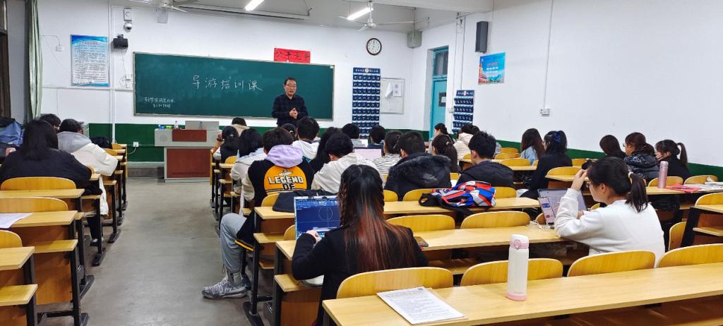 培训会上,骆明老师将导游工作分为作为一位导游应具备的条件、如何做好的导游基本功两个部分为同学们进行讲解。骆老师认为作为一位合格的导游,应具有丰富的知识,与文创相结合,抓住团体需求,与当地文化相结合,具备完备规划路线及讲解词的能力。而后,他强调讲解是导游的基本功,具有语言艺术的讲解往往扣人心弦,讲解的语气也要注意因时因地而异,做到余音绕梁之效。同时,讲解时的肢体语言也需要注意,如站姿,手活动的范围等。骆老师特别指出讲解过程中忘记导游词时,可以借助景点介绍牌提醒我们,或让游客进行自由活动,抑或是将其作为悬念包袱扔给游客。