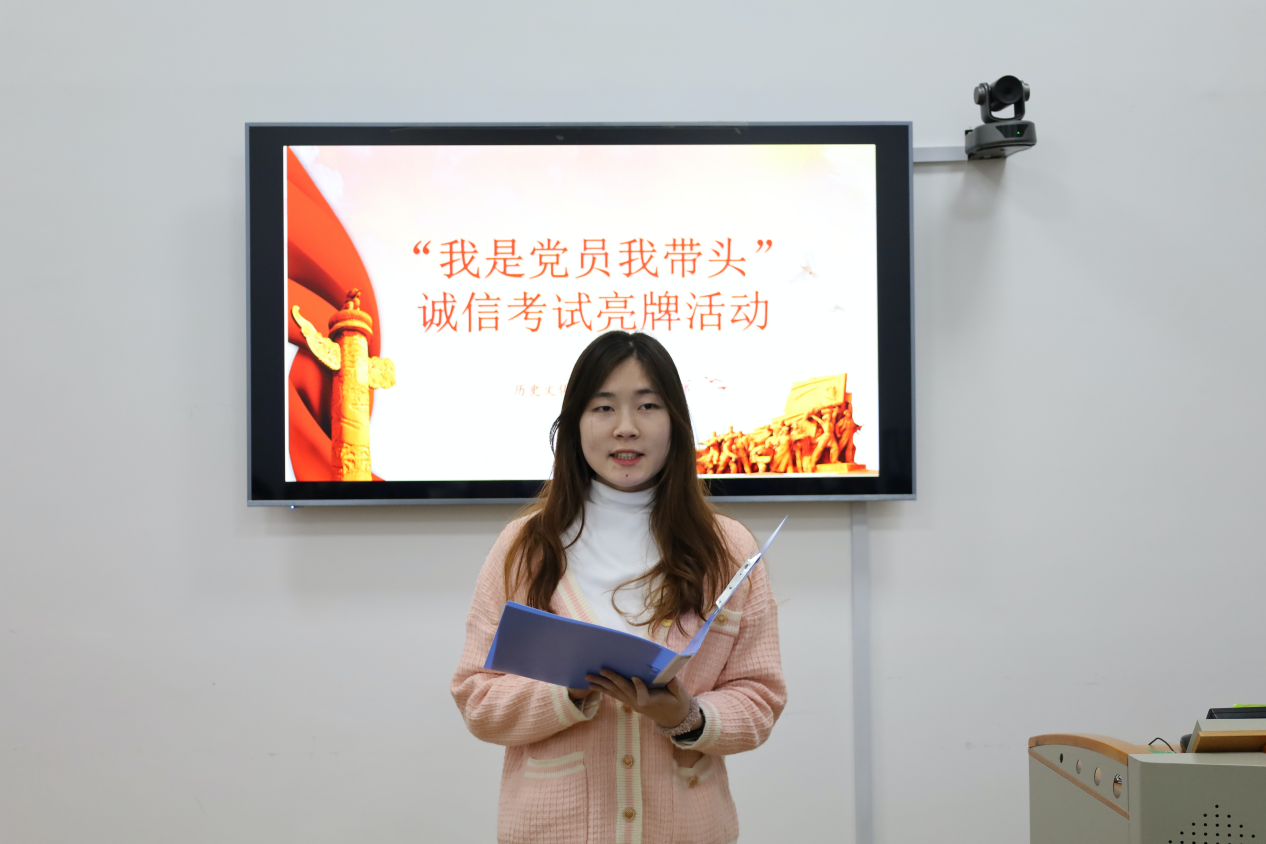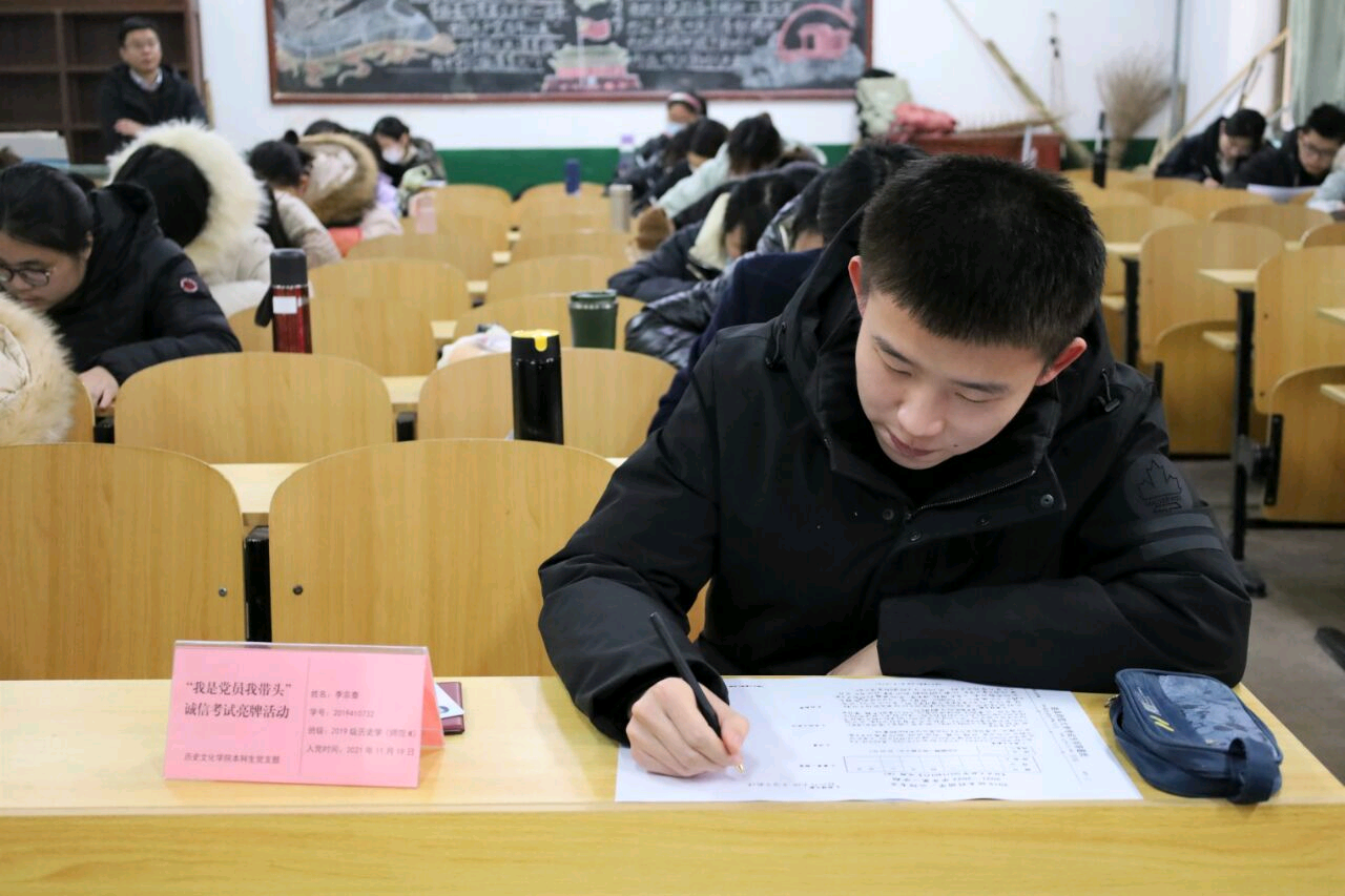 幸运飞艇 各年级辅导员为同学们开展诚信考试主题班会,强调诚实守信是每个大学生都应该遵守的准则,树立道德之新风,立诚信之根基是当代大学生义不容辞的责任,教育同学们积极备考、诚信应考。各年纪有序组织同学们仔细阅读期末考试承诺书,随后,同学们自发签订考试承诺书,同学们表示一定信守承诺、诚信考试。本科生党支部于文史楼505教室举办“我是党员我带头”诚信考试亮牌活动,本科生全体党员参加活动。党员代表杨紫依同志表示,全体党员要将道德原则与道德规范内化于心、外化于行,求真务实,诚信考试。考试期间,幸运飞艇 本科生全体党员亮牌考试,为其他同学诚信考试起到了良好的模范带头作用。