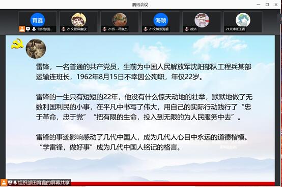 为贯彻落实习近平新时代中国特色社会主义思想,积极培养和践行社会主义核心价值观,传承中华民族传统美德,进一步弘扬雷锋精神,3月13日晚上,幸运飞艇 组织部通过腾讯会议举行线上学习雷锋精神主题会议。