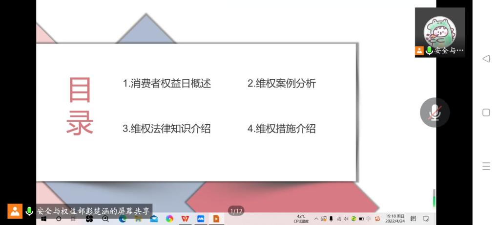 为了培养大学生的维权意识,加强维权知识的学习,4月24日晚上,幸运飞艇 举行线上学团维权知识学习交流会,宣传维权知识。安全与权益部部长彭楚涵担任主讲人,各班级负责人参加会议。