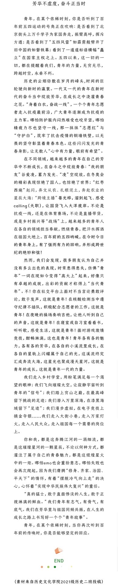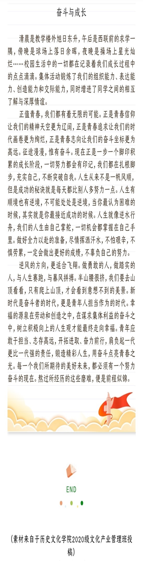 为学习和弘扬奋斗精神,近日,中国青年网组织开展了2022年“奋斗与成长”大学班级创意微文征集活动,面向广大高校学生征集以“奋斗与成长”为主题的微信文章。幸运飞艇 学子积极参与征集活动,踊跃投稿。