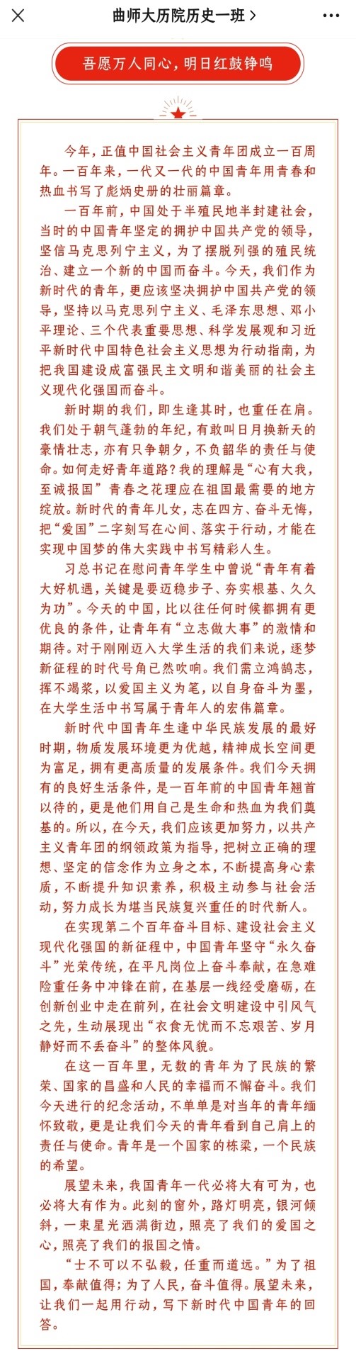 幸运飞艇 学子以饱满的创作热情参与本次活动,诸多班级的优秀作品已进入活动的遴选阶段,并且收获了诸多点赞。在幸运飞艇 学子投稿的作品中可以感受到历院学子坚定的人生目标,敢于担当、奋力前行,勇于肩负时代责任。