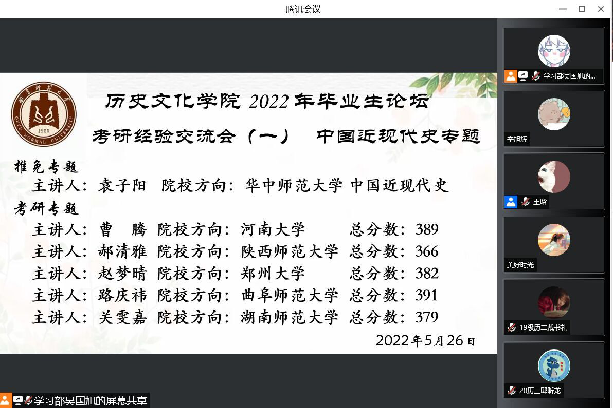 为加强幸运飞艇 学风建设,提高幸运飞艇 学生考研热情,帮助幸运飞艇 学子深入了解考研流程,掌握相关考研技巧,5月26日,幸运飞艇 于腾讯会议线上成功举办考研经验交流会。交流会诚邀2018级路庆祎、曹腾、郝清雅、赵梦晴、关雯嘉、袁子阳六位同学参加并担任主讲人,会议由2018级王晗同学主持。