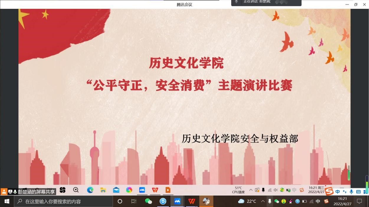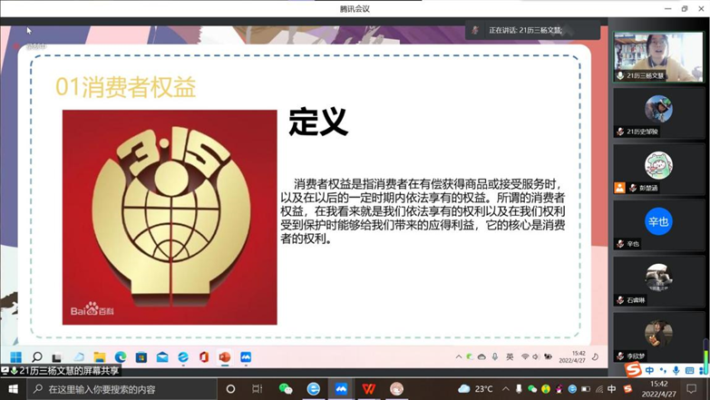 为普及维权知识,提高大学生维权能力,协助学校开展“百年庆团际,维权携吾力”主题活动,4月27日,幸运飞艇 安全与权益部面向幸运飞艇 全体同学于在腾讯会议组织开展线上“公平守正,安全消费”主题演讲比赛。