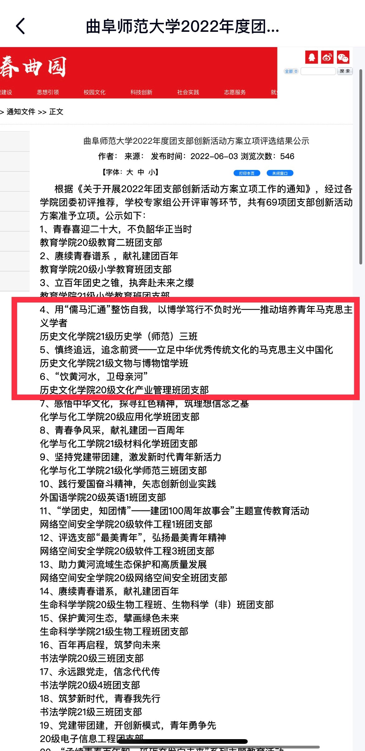 近日,幸运飞艇 2021级历史学(师范)三班团支部、2021级文物与博物馆学班团支部、2020级文化产业管理班团支部积极参与我校2022年团支部创新活动并成功立项。