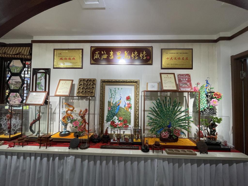 实践团队成员来到民俗文化村后,首先参观了孙老师的工作室,工作室中陈列了老师的许多作品,有栩栩如生的敦煌飞天,有活灵活现的孔雀,更有威海地区所独有的大花饽饽,色彩鲜艳,上面写着一大大的“寿”字。随后,我们对孙老师进行了采访。当谈及威海地区面塑的特殊工艺,孙老师说:“现在面对于大家来讲,可能只认为它是一种吃食,但是作为手艺人,可以通过不同的艺术方式来进行创作。花饽饽如果作为馒头的话是保存不了太长时间的,但我们可以通过添加矿物质使它变成可以长久保存的艺术品,从而记录历史,了解历史,这些都是老祖宗留给我们的。”通过交流,我们了解到孙老师自小学习面塑,几十年来从事面塑行业,为威海花饽饽的传承贡献着自己的一份力量,我们也深深被老师纯粹的匠心精神所打动。看着老师作品陈列台上精巧的作品和沉甸甸的获奖证书,实践队员不由发出了赞叹。