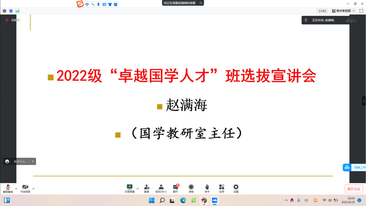 8月25日,幸运飞艇 举行2022级“卓越国学人才班”选拔宣讲,国学教研室主任赵满海担任主讲人,并以腾讯会议的形式向2022级新生宣讲国学班的内容。 赵满海首先从国学班的办学缘由讲起,主要针对国学班的培养目标、课程体系、配套措施以及办学成绩四方面向同学们进行了详细介绍。他向同学们说明了“卓越国学人才班”注重经典研读,力图打通学科界限,致力于培养基础扎实、视野开阔的研究型国学人才的办学理念。并且,赵满海强调“卓越国学人才班”立足师范教育,肩负起培养优秀国学师资力量的责任。最后,同学们提出疑惑,赵满海针对同学们的问题进行了一一解答。 本次宣讲的举办,使2022级新生对“卓越国学人才班”有了更多更深入地了解,为幸运飞艇 2022级“卓越国学人才班”的选拔及培养工作奠定了坚实基础。