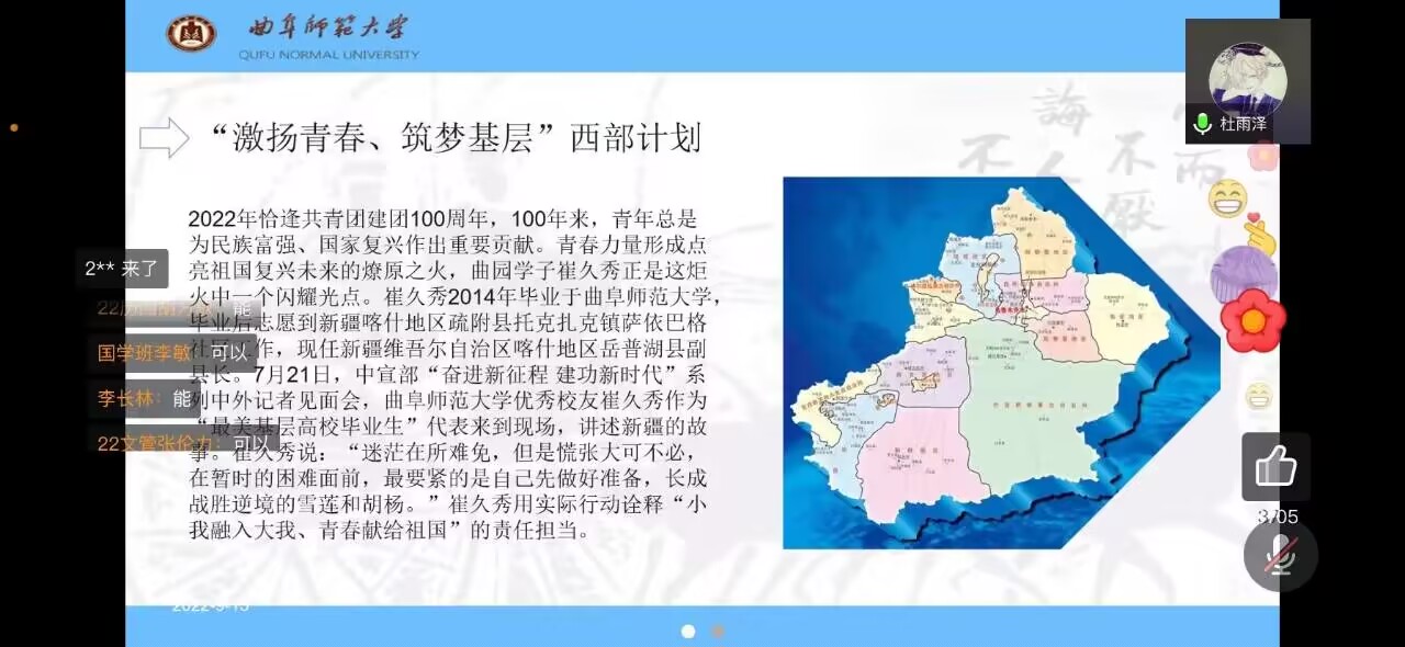 会议上,杜雨泽讲到2022年恰逢共青团建团100周年,100年来,青年总是为民族富强、国家复兴作出重要贡献。青春力量形成点亮祖国复兴未来的燎原之火,我校学子崔久秀正是这炬火中一个闪耀光点。他重点提到崔久秀2014年毕业于我校,毕业后志愿到新疆喀什地区疏附县托克扎克镇萨依巴格社区工作,从迷茫到热爱,从不适应到适应,崔久秀积极投身西部建设,为新疆基层工作尽心尽力。最后,杜雨泽希望新生如崔久秀一样用实际行动诠释“小我融入大我、青春献给祖国”的责任担当。