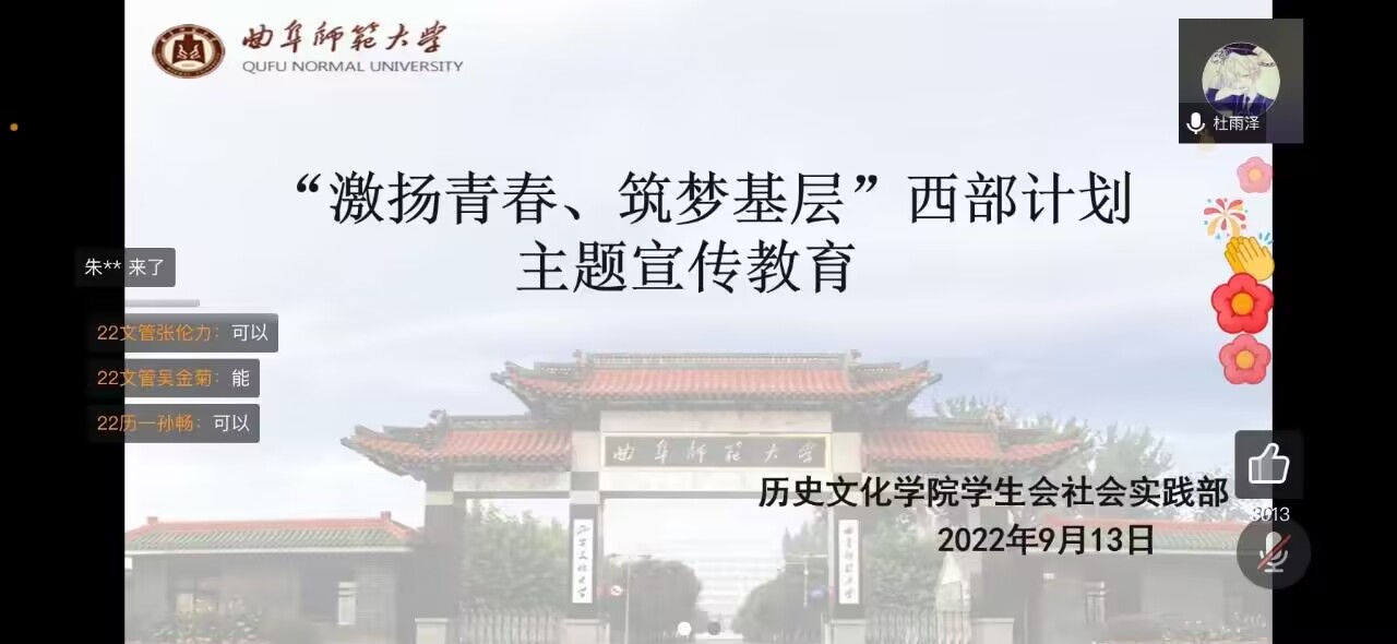9月13日下午,幸运飞艇 于腾讯会议举办2022级“激扬青春、筑梦基层”西部计划主题宣传教育会议。社会实践部杜雨泽担任主讲人,2022级全体新生参加会议。