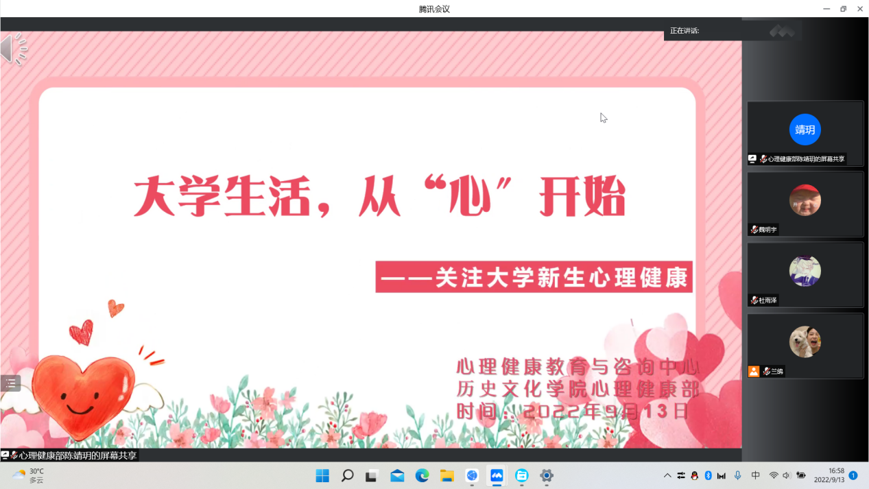 为引导新生培养理性平和健康的心态,9月13日下午,幸运飞艇 于线上开展心理健康主题班会。本次会议由幸运飞艇 心理健康部主持,幸运飞艇 22级新生参加。