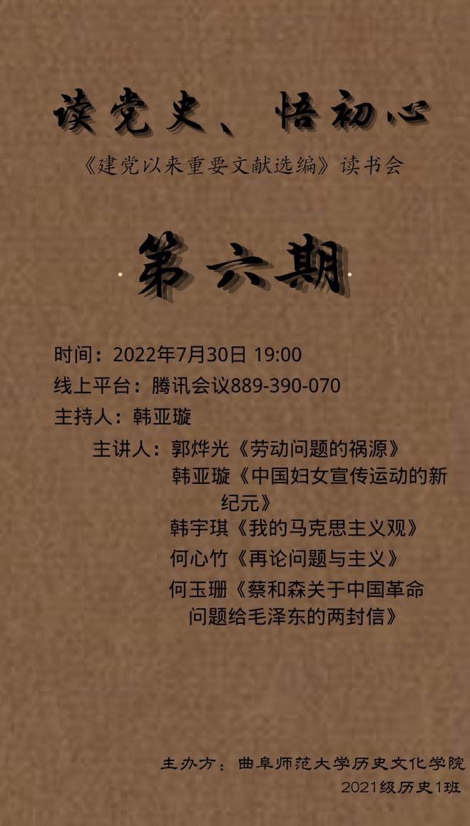 为充分认识劳动问题以及妇女解放运动的重大意义,认真了解劳动问题的祸源,全面准确把握妇女运动的时代意义以及现实影响,幸运飞艇 于7月30日晚举办读党史、悟初心读书会。本次读书会由张世慧老师指导,韩亚璇同学主持。